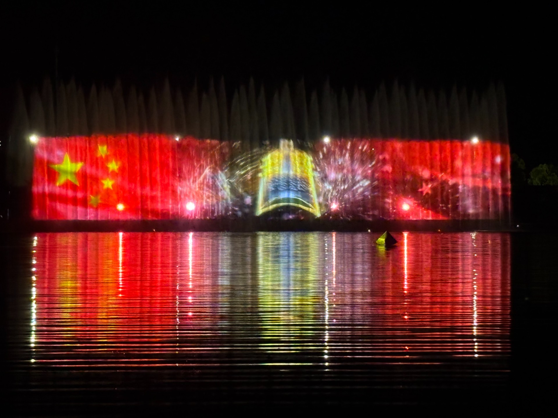 暮色为白云湖镀上一层薄纱时,沿岸的景观灯尚未完全亮起,湖心突然传来一阵细密的水声——数十组高压水炮同步启动,澄澈的湖水从湖面跃出,在夜空中织就一道宽达60米、高逾15米的直流水幕。水幕上,汉江与涢水在随州交汇的地理图景缓缓展开,蓝色的光影化作两条奔流的江河,在水幕中央相拥后"注入"真实的白云湖。巴可UDX-W40投影机的40000流明高亮度,在水幕上催生出极具穿透力的画面。最令人惊叹的是光影与湖水的互动场景。水幕上,汉江与涢水在随州交汇的地理图景缓缓展开,蓝色的光影化作两条奔流的江河,在水幕中央相拥后"注入"真实的白云湖。此刻,水下的LED灯同步亮起,湖面泛起与水幕同源的蓝光,光影从水幕延伸至湖面,形成"水天一体"的奇观。
